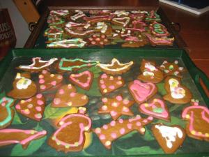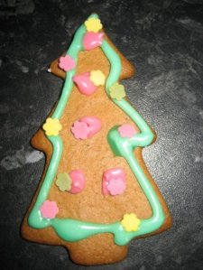 Ruuan jälkeen tehtiin tyttöjen kanssa niitä pipareita, mutta ennen kuin kaikki oli edes vielä uunista ulkona, tulivat tyttöjen serkut meille illaksi ja esikoinen meni leikkimään dinoilla serkkupojan kanssa. Koristeltiin siten piparit kaksistaan tosikoisen kanssa. Olin juuri eilen ostanut koristelua varten pari uutta kuorrutetuubia, mutta niistä toinen olikin rikki! Tytär sai valkoiset sokerikuorrutteet käsilleen, kun sitä ei tullutkaan ulos vain oikeasta päästä vaan myös sieltä väärästä… Niinpä pursotettiinkin valkoista tuubin perältä. Mutta ihan hienot piparit saatiin silti!