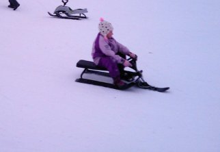 Lapset eivät edes yrittäneet hyppiä, mutta kaatuilivat silti laskunsa aina silloin tällöin. Eikä se mitään, mutta kävipä sitten niinkin, että esikoisen polvi vääntyi erään kaatumisen seurauksena. Mäenlasku suksilla loppui siltä erää siis siihen ja autoin itkevän linkuttavan lapsen ulkoilumajan kahvioon kaakaolle ja pullalle. Kipu jalassa hellitti sen verran, että esikoinen oli sitä mieltä, että pystyy laskemaan vielä pulkkamäkeäkin. Ja kun jotenkin sillä jalalla pystyi kulkemaankin ja pulkkaa vetämään, suostuinkin ja mentiin mäkeen parin pulkan ja yhden stigan kera.
