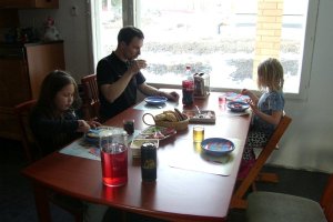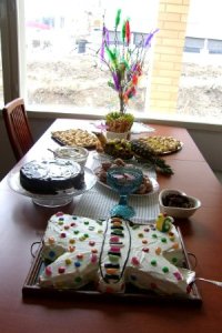 Lauantaina oli esikoisella koulupäivä, avoimin ovin. Joten suunnattiin koko perhe koululle yhdeksäksi ja oltiin siellä eka tunti opetusta seuraamassa kaikki. Ekalla välitunnilla minä, mies ja tosikoinen lähdettiin kotia kohti. Minä painuin suoraan keittiöön, missä suurin osa loppuviikonlopusta kuluikin. Mies lähti tosikoisen kanssa hakemaan pajunkissoja jokivarresta. Esikoisen tultua kotiin koulusta, oli jo tosikoisen synttäripöytä melkein valmiina ja pajunkissat odottamassa että tytöt ne illalla koristelivat.