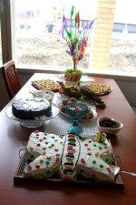 Kolmen aikaan meille alkoi tulla ystäviä ja sukulaisia. Parisenkymmentä vierasta, eikun tuttua – ja minulla keittiössä kattaminen kesken… Aina se vaan menee viime tippaan ja vähän yli. Ei se mitään, porukka jutteli, minä seilasin keittiön ja eteisen väliä, laittaen loppuja kuntoon keittiössä ja ottaen vieraita vastaan. Kyllä oli kiva järkätä juhlat täällä meidän talossa, ekaa kertaa! Eihän tämä vielä ole valmis, mutta isossa keittiössäni kelpaa kyllä leipoa ja kokata ja täällä on tilaa ja tämä on ihana 🙂