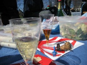 Täällä oli lähtiessä 18 astetta lämmintä, eikä juurikaan tuullut. Kokemuksesta viisastuneena pakkasin koko porukalle kuitenkin fleeceä ja sormikkaita mukaan – olen riittävän monena Vappuna palellut Stadissa. Siellä oli tänään lämpimämpi kuin odotin, mutta ei nuo vermeet hukkaan menneet. Siellä kun istui Tähtitorninmäellä useammankin tunnin pikniköimässä, veti ihan mielellään nahkarotsin alle tai jalkojen päälle sitä fleeceä. Aurinko paahtoi ihanasti kyllä ja nyt on naama saanut väriä (olkoonpa sitten punaista tai ruskeaa 😛 ), mutta tuulihan tuolla meren äärellä on viileä.