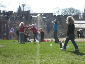 Vaikka sää oli niinkin lämmin ja upea, oli vapunvietto ihmeen rauhallista, ainakin tuossa missä me oltiin. Ei juuri örveltäjiä, ihan vaan seurueita piknik-koreineen ja skumppapulloineen. Arabeja vesipiippuineen. Yksi porukka puhalteli saippuakuplia, mistä likkalauma tietty riehaantui ja alkoi juosta kuplien perässä niin että sai toppuutella vähän, etteivät nyt toisten ruokien ja juomien päälle juosseet. Eniten huomiota herätti vähän äänekkäämpi seurue, johon kuului myös olutta litkivät tiikeri, possu ja lehmä, joilta tytöt kävivät opettelemassa kirosanoja. Jep.