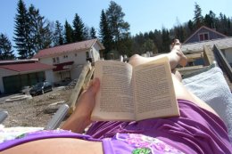 Tosikoinen teki minulle seuraa pihalla, loikoili bikineissään vieressäni toisessa aurinkotuolissa ja piti huolen siitä, ettei minulla käynyt aika pitkäksi kirjani kanssa 😉 Puheli jatkuvasti kaikenlaista minulle. Eikä se häirinnyt lukemistani edes. Olen vuosien varrella oppinut hyvinkin lukemaan ja juttelemaan lasten kanssa samanaikaisesti. Ei ehkä täysin läsnäolevaa, muttei täysin poissaolevaakaan.