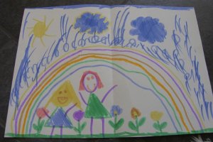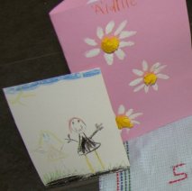 Esikoinen oli tehnyt minulle vohvelikankaasta pannulapun ja pöytäliinan. Tosikoinen oli värkännyt päiväkodissa kaulakorun, jossa on kolme puuhelmeä ja pari tuohirullaa. Tosikoisen lahjan sainkin jo torstaina päiväkodin kevät- ja äitienpäiväjuhlassa, joten nyt sain kahvini, voileipien ja valkovuokko-rentukka-kimpun ohessa kolme kirjekuorta, joissa oli piirustuksia. Lasten itse tekemät jutut on kerrassaan parhaita lahjoja 🙂 Mitään sen suureellisempaa en todellakaan äitienpäiväksi kaipaa.