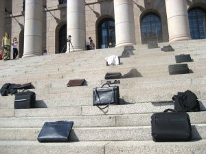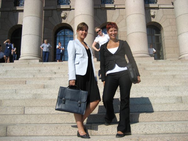 Oikeasti vältyttiin ihmeeksi kyllä kaikilta kompuroinneilta ja kaatumisilta, vaikka eduskuntatalon portaat ovat aika kapeat ja niissä on painumista tulleita saumoja. Eikä kukaan tainnut saada salkkuakaan päähänsä, joten ainakin haavereilta vältyttiin. Ja kaiken kaikkiaan, meillä oli hauskaa kaikesta kuumuudesta huolimatta. Sitä helpotti, kun sai välillä vähän vettä ja huilia portailla lahkeet polvissa, kengät poissa jaloista ja jakku poissa päältä.