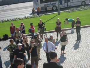 Siellä oli osan aikaa mediakin paikalla. Kun palattiin aamun sämpylä- ja kahvitauolta portaille ja alettiin vetää pikkutakkeja ja jakkuja päälle, oli paikalle saapunut jo koko lauma valokuvaajia, uutiskuvaajia ja toimittajia. Kertoikohan heille kukaan, että aloitimme treenit seiskalta? Ja sitä ennen puvustuksen tarkistus, eli paikalla oltiin puoli seiskan pintaan. Ja oli muuten kuuma jo silloin!