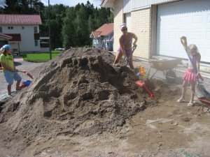 Viime viikolla ennen Lumon tuloa meille, perjantaina ja lauantaina lapioitiin ja kärrättiin hiekkaa tuolla pihalla koko perheen voimin. Perjantaina siinä oli naapuritkin omalla pihallaan tekemässä ulkohommia, hieno ilma kun oli. Naapureilla oli radio ulkona, siellä soi joku iskelmä- ja mustelmateollisuus, suomalaista iskelmää kumminkin. Tuli siinä bikinit päällä ja huivi päässä huhkiessa jotenkin mieleen vanhat kotimaiset elokuvat. Lauantaina otin pihalle meidän radion, ja sain työllä ja tuskalla soimaan Cityn – asutaan alueella, jossa ei tunnu paljon muu kunnolla kuuluvan kuin iskelmä…