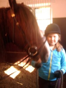 Tänään oli sitten eka tunti, kun pääsi ratsastamaan. Tytär oli ihan tohkuna, sillä sai ainoana ryhmässä vähän isomman hevosen eikä ponia. Esikoinen näytti olevan tämän alkeisryhmän reippain (ainoa, joka kysyy rohkeasti ja vastaa rohkeasti) ja lisäksi pisin, joten tuo vähän isompi polle lankesi hälle kuin luonnostaan. Tytär on jotenkin luontaisesti hevosten kanssa ihan kotonaan. Minä sitä katselin vähän jeesaillessani tytärtä ja tämän paria tuon toisen tytön shettiksen kuntoon laitossa ja tunnilla avustanut hevostenhoitaja kysyi tyttäreltä, onko tämä paljonkin jo ratsastanut kun niin tottuneesti tekee ja toimii hevosen kanssa.