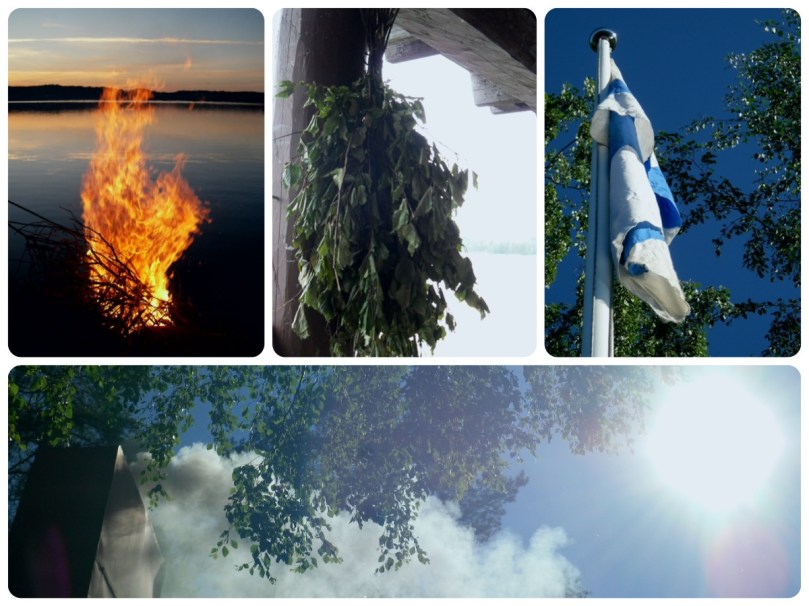 Juhannusaattopäivä soljui siinä mustekalaa ja bratwursteja grillaillessa ja syödessä, kokeilivatpa tytöt ja mies vähän kalaonneaankin siinä laiturinnokassa. Ilmassa leijui maailman ehkä paras tuoksu: meidän landen saunan lämmityksestä nouseva savu. Illemmalla, lipunnoston jälkeen oli aika päästä nauttimaan löylyistäkin, kera isäni tekemien vihtojen. Tytöistä tosikoinen suorastaan vähän ui, kaksi muuta lähinnä kastautuiksivat laiturilta, sen minkä kylmään veteen kärsivät mennä. Minäkin heitin talviturkkini järveen, vastoin normaalia kylmänkarttamistani – yleisesti ottaen veden pitää olla vähintään 26 asteista ennen kuin minua sinne saa. Kyllä tuntuikin hyvältä pulahtaa saunasta järveen!