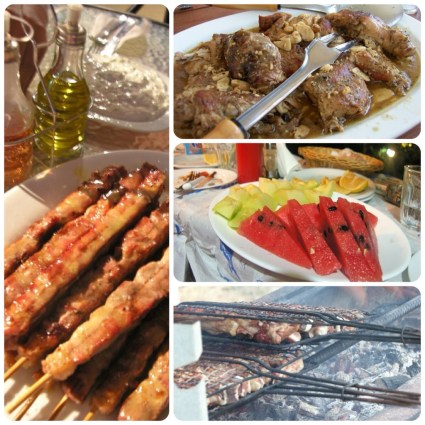 We cooked many dinners at home too – the very best of those the whole rabbit we cooked on the evening of my girls night out with friends – but we also dined in many nice tavernas. One evening we drove to one of the small villages, Ktikados, and had dinner in a small taverna with only a couple tables on a balcony facing the village square and the valley with Tinos town and the sea behind it. Once we went to Volax, where the girls gave us a small performance in the amphitheater before dinner. We also had a grilling party – the traditional lamb chops and Tinos sausages, with chicken and different salads – one evening, with 22 people, 13 of which were children, a proper gang!