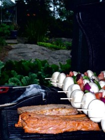 Vielä ei kuitenkaan satanut, joten kuljeskeltiin vähän katselemassa ympärillemme, ja heitin nostalgisena keppiä terrierin kanssa, ennen kuin alettiin vartaidenlaitto- ja grillauspuuhiin. Ja kun lopulta saatiin vartaat ja lihat grilliin – joka onneksi oli terassilla katoksen alla, alkoikin jo tiputtaa sitä vettä. Katettiin siis meidän mökkifeast sisälle ulkotilojen sijaan, ja kuulosteltiin lähestyvää ukkosta. Siihen mennessä kun istuttiin pöytään, oli jo aivan pimeää ulkona. Ukkonen jylisi jossain kaukana.