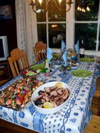 Sisällä meillä oli kuitenkin hauskaa ja kodikasta, keskustelun ollessa välillä jopa niin eloisaa, että niin pöytäliina kuin voi ja leivätkin saivat punaviinimarinoinnin (ei, se en ollut minä, uskokaa tai älkää, vaikka sattumoisin juuri minun paikkani pahiten viinissä olikin 😉 ). Porsaanfileet, herkkusieni-paprika-tomaattivartaat, silli, uudet perunat, suolakurkku, salaatti… Kyllä maistui ruoka hyvältä siellä saaressa, sateen ropistessa kattoon.