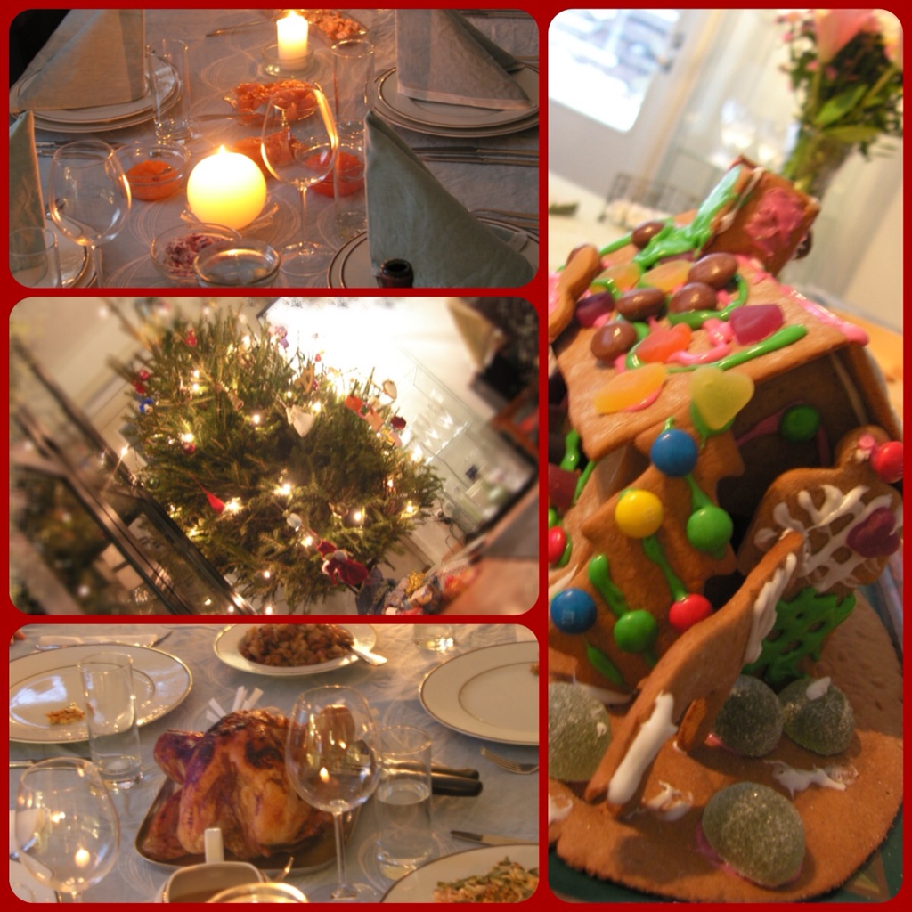 Our Christmas (Eve, of course) meal was a stuffed (with pomegranate, pear and walnuts) turkey with sauce and a green beans and mushrooms casserole, after hors d'ouvres of salted and smoked salmon, and salmon and minoe caviars. No dessert – I mean, seriously, who can stomach a dessert after a proper Christmas meal? Too many times left uneaten, we didn't make any. Instead we ripped apart and ate the gingerbread house later in the evening.