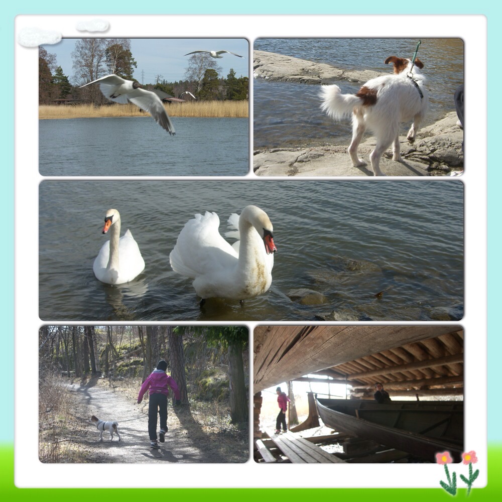 Viikonloppu oli auringonpaistetta, ulkoilua, vesisadetta ja synttäreitä. Sunnuntaiaamun valjetessa sateisena ja koleana, kävellessäni Meggien kanssa tutun aamulenkkimme kylmästä hytisten, olin oikein tyytyväinen siihen, että lauantaina patistettiin tytöt 2/3 (kolmannen ollessa tallilla ratsastamassa ja talkoilemassa) sängystä ylös suht ajoissa, vaatteisiin ja ulkoilemaan. Vietettiin aurinkoinen, jos kohta tuulinen, mukava parituntinen Seurasaaressa. Koira nautti, ihmiset nauttivat.