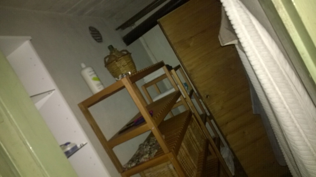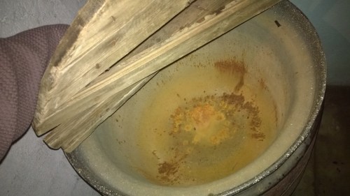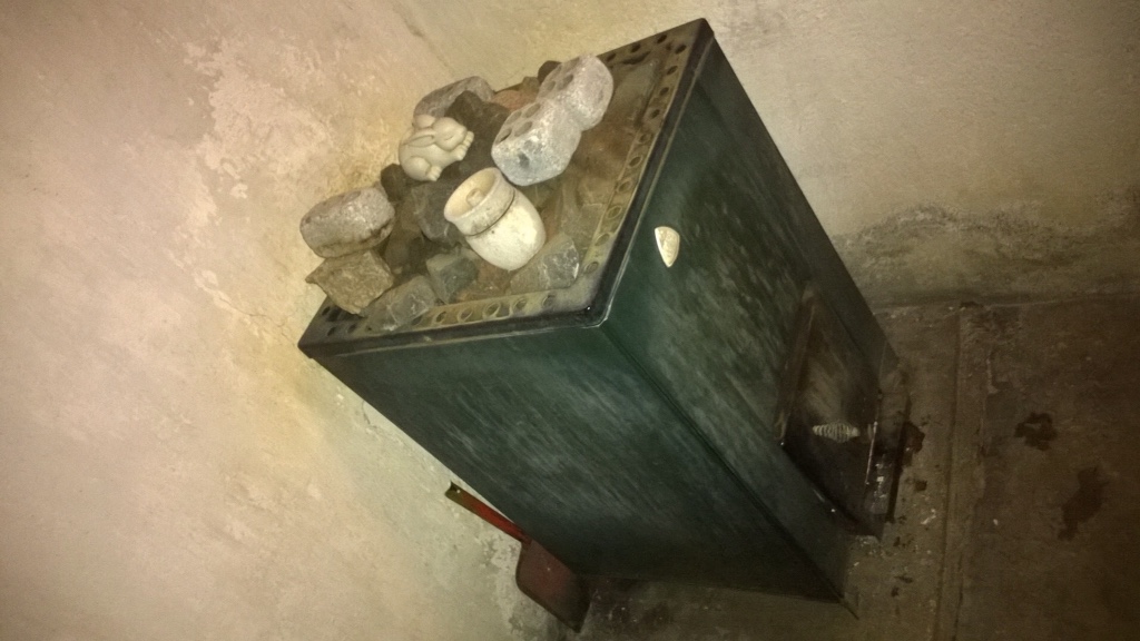 Pesuhuoneessa on vanha saunapatakin. Talon omistajan mukaan sitä ei kannata enää käyttää. Rehellisesti sanoen, padan sisus ei oikein houkuttelekaan siihen… Mies ja muutossa jeesimässä ollut kaverinsa kuitenkin jo keksi sillekin käyttöä: täyteen jäitä ja olut- ja siideritölkit kylmään 😀 Ehkä sitten, jos joskus tuparit pidetään…