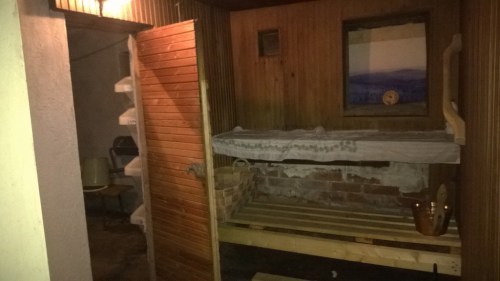 On se puusauna vaan ihan toista kuin sähkösauna. Pehmeä löyly, puusaunan tuoksu, vanhan saunan tunnelma. Melkein kuin mökillä olisi, keskellä Helsinkiä. Saunan ja suihkuhuoneen lattia on silkkaa betonia, vähän jo rapistuvaa, ei niin miellyttävää. Ostoslistalle puu- tai muoviritilöitä laitettavaksi lattioille. Ja himmeämpi lamppu saunaan; saunatunnelman vähän pilaa liian kirkas valo.