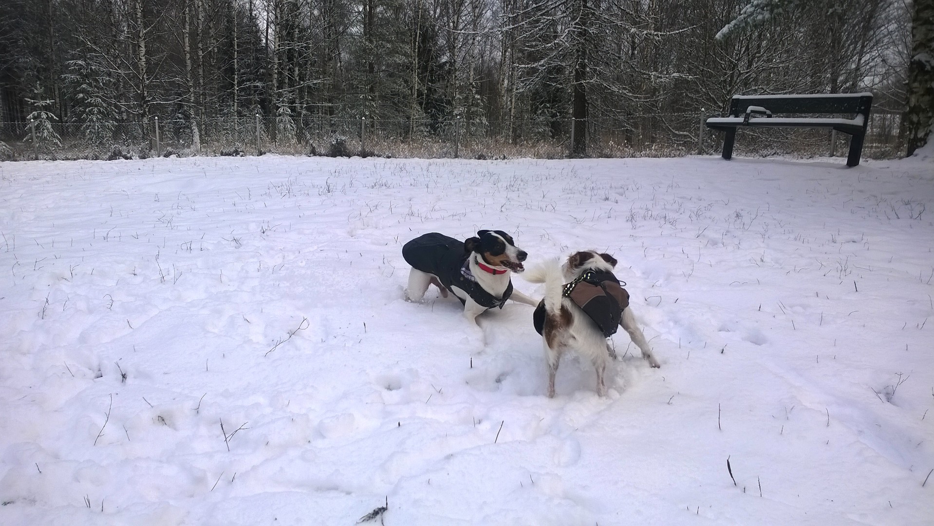 Eilen tuli ensilumi ja koirat menivät ihan sekaisin. Vetivät ja nuuskivat ja pomppivat ja huiskivat siihen malliin, että päätin tänään kävellä niiden kanssa tuonne entisille kotikulmille koirapuistoon, jotta saavat vähän telmiä lumessa. Meuhasivatkin siellä aikansa, minkä jälkeen niille tuli kylmä ja lähdettiin takaisin kotiin. Vaikken lumesta laisin piittaakaan, kyllähän tämä marraskuinen maisema näin paljon kauniimpi ja valoisampi.