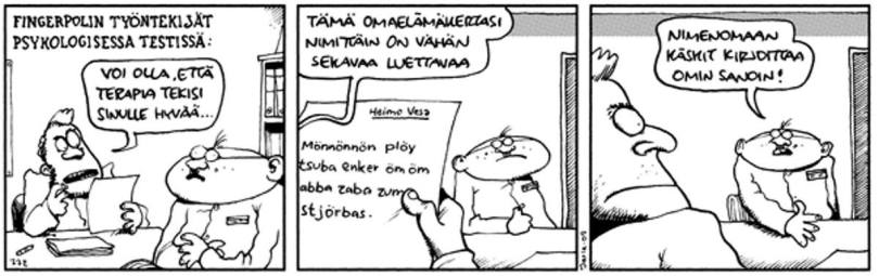Paljon valitetaan tänä päivänä englannin ylivallasta Suomessakin, Helsingissä nyt varsinkin. Valitetaan, ja pelätään suomen katoamista. Jopa kielen tutkijat – tai ehkä juuri he – ovat huolissaan kielen kehityksestä. Minä en ole. Suomi suomena on lopultakin nuori juttu. Satavuotias tai näin. Vielä edellisen vuosisadan vaihteessa venäjällä oli vahva asema etenkin kaupunkilaisten elämässä, eikä ruotsikaan ollut täysin otettaan menettänyt. Ei tietenkään ole vieläkään.