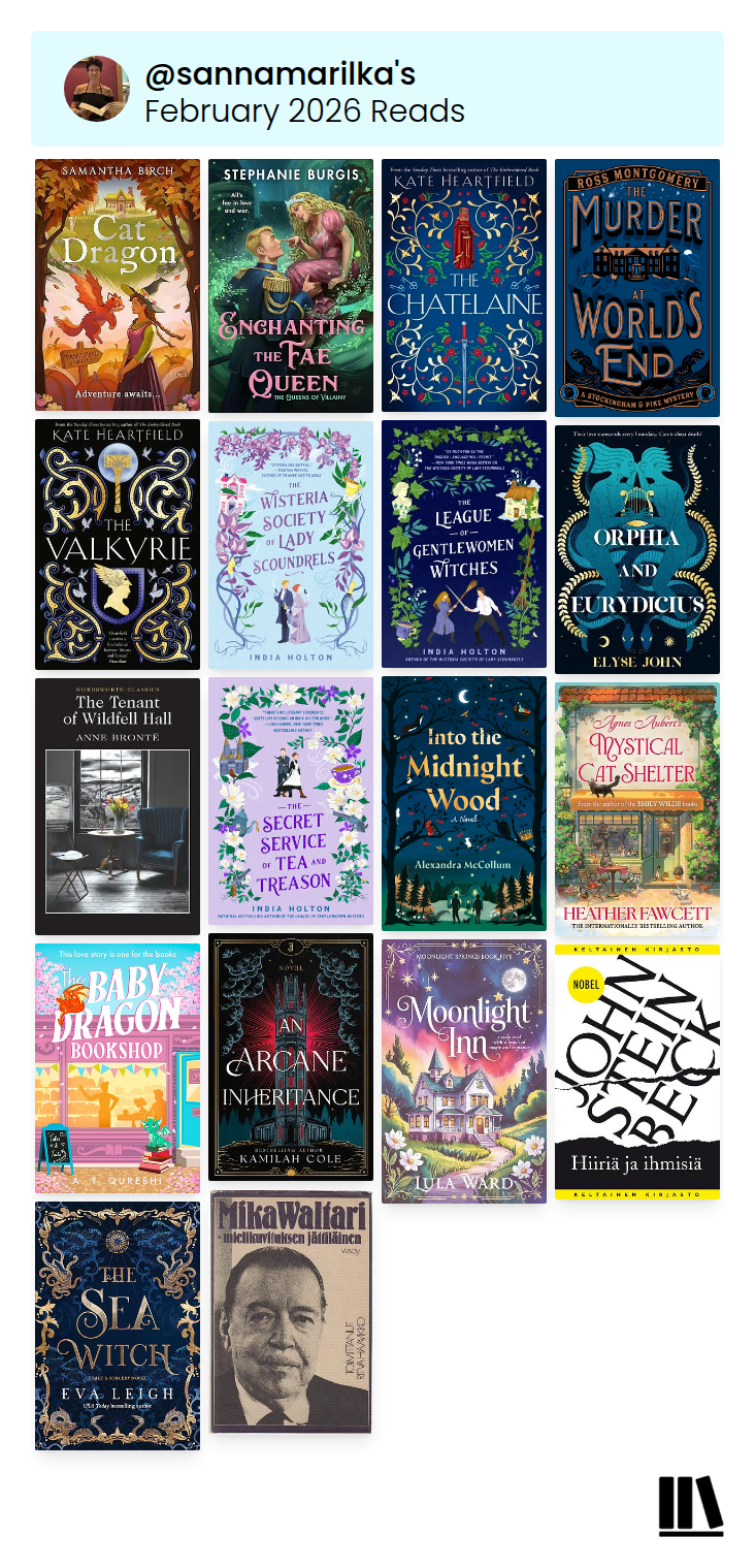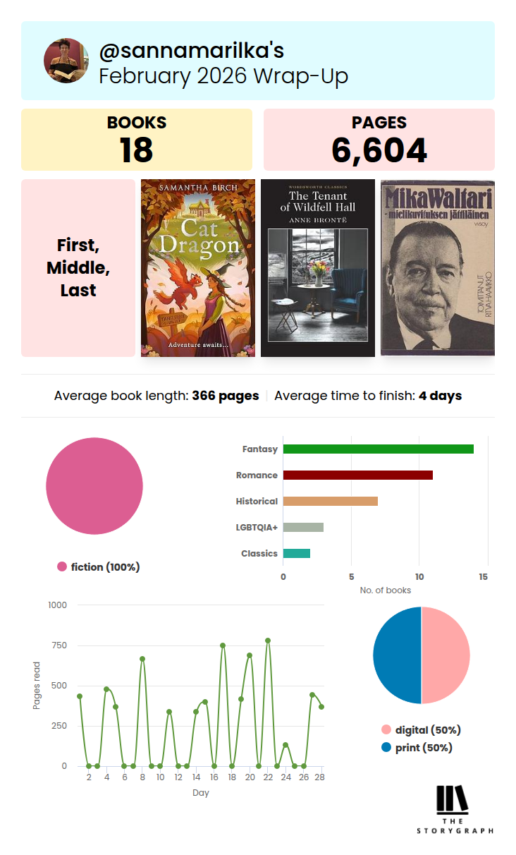 There’s still too much going on in my life, too much stress, too many things. I escape into books as much as I can, and my one week vacation obviously offered much opportunity for that, though there was a lot going on during that time too. So anyhow, 18 books, 6604 pages, a lot of excellent books in Febuary💜