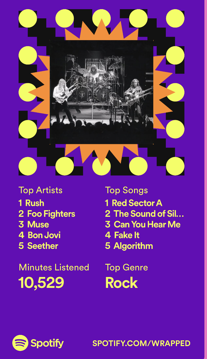 As already stated above, I listened to music for 10490 minutes last year (or the first 11 months of it, since Spotify actually gives the stats at the end of November, oddly enough). My top five artists were Rush, Disturbed, Foo Fighters, Avenged Sevenfold, and Seether. Rush and Foo Fighters are always in top 5, the three other ones vary from year to year. My top genre was Rock, as usual. The variations are Rock, Alt Rock, Alt Metal.
