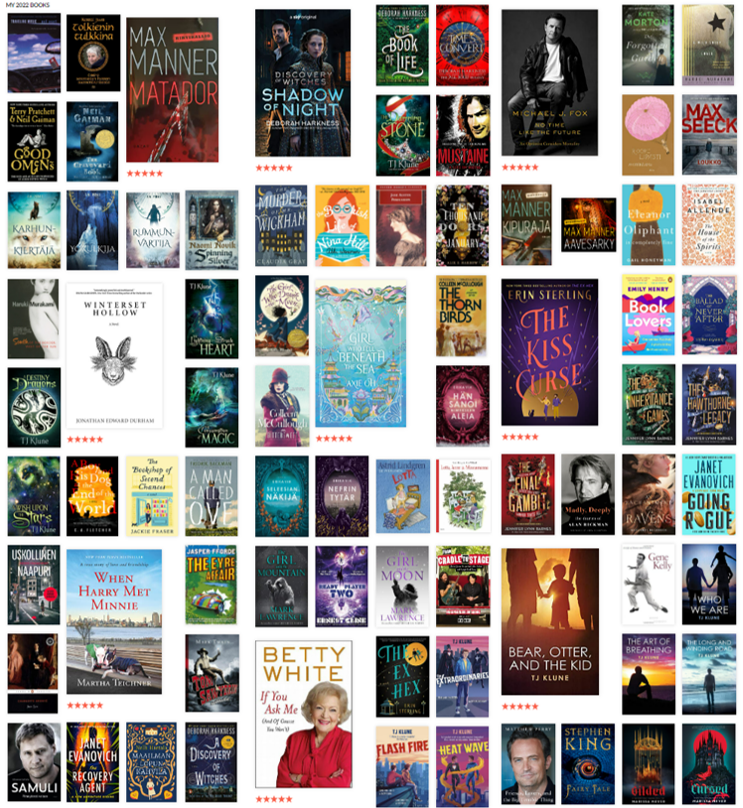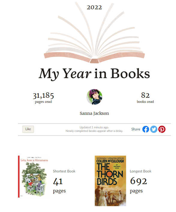 Actually my favorite stats, naturally! And since Goodreads offers a very meager amount of stats, basically just the amount of books and pages per year, I decided to start using StoryGraph for my reading tracking, too. I even got last year’s stats nice and neat after exporting-importing all my book data from Goodreads to StoryGraph. Unfortunately StoryGraph is missing three books from my last year’s reads, probably because they’re Finnish books not found in their database (I actually requested the add of two Finnish books to Goodreads last year, so not surprised if they’re not found in StoryGraph either).